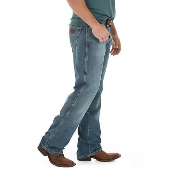 These Wrangler jeans offer a comfortable mid rise, relaxed fit through the seat and thigh, and a leg opening that fits perfectly over your favourite pair of boots. With a modern sensibility, these men's relaxed fit bootcut jeans are everything you want in a pair of jeans.